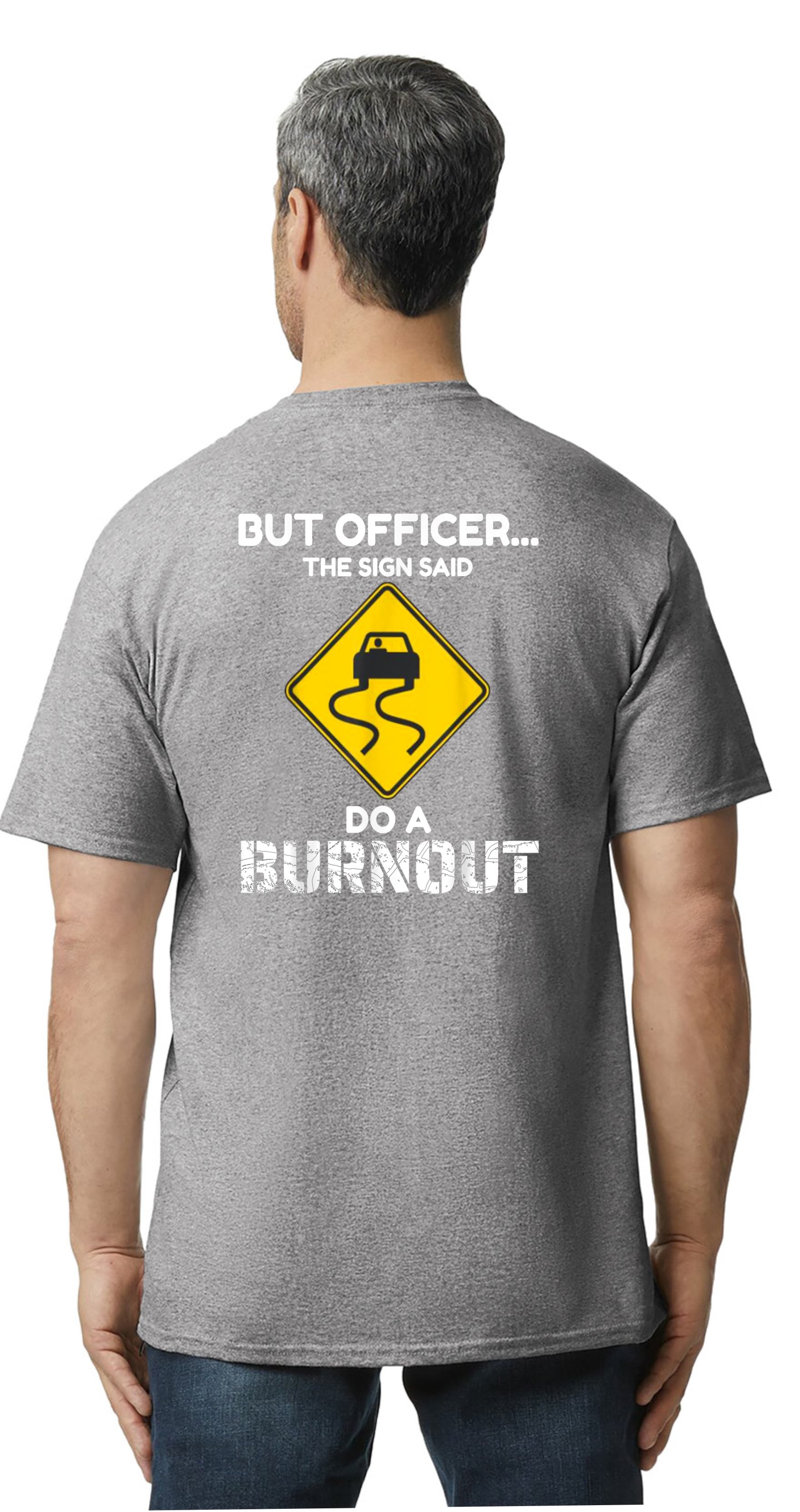 But Officer, the sign said do a BURN OUT! This race inspired design is guaranteed to catch attention. Made with lightweight and breathable fabric, it's perfect for daily wear.