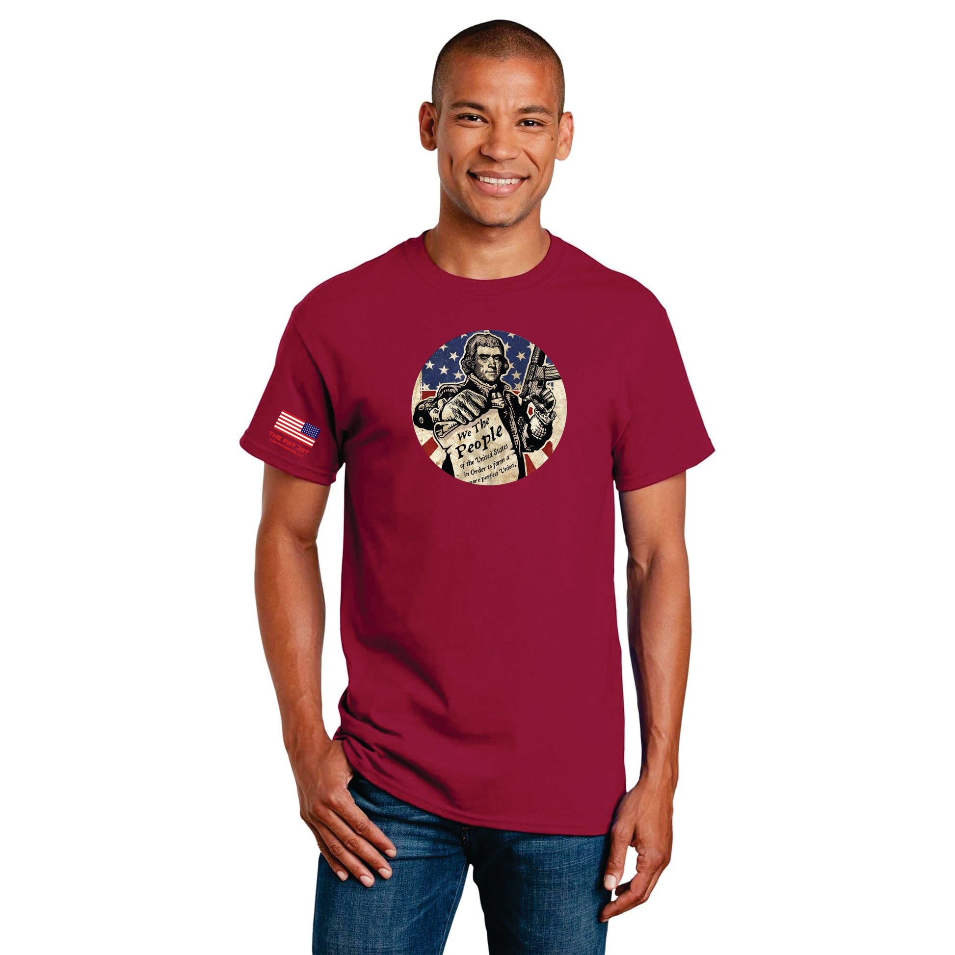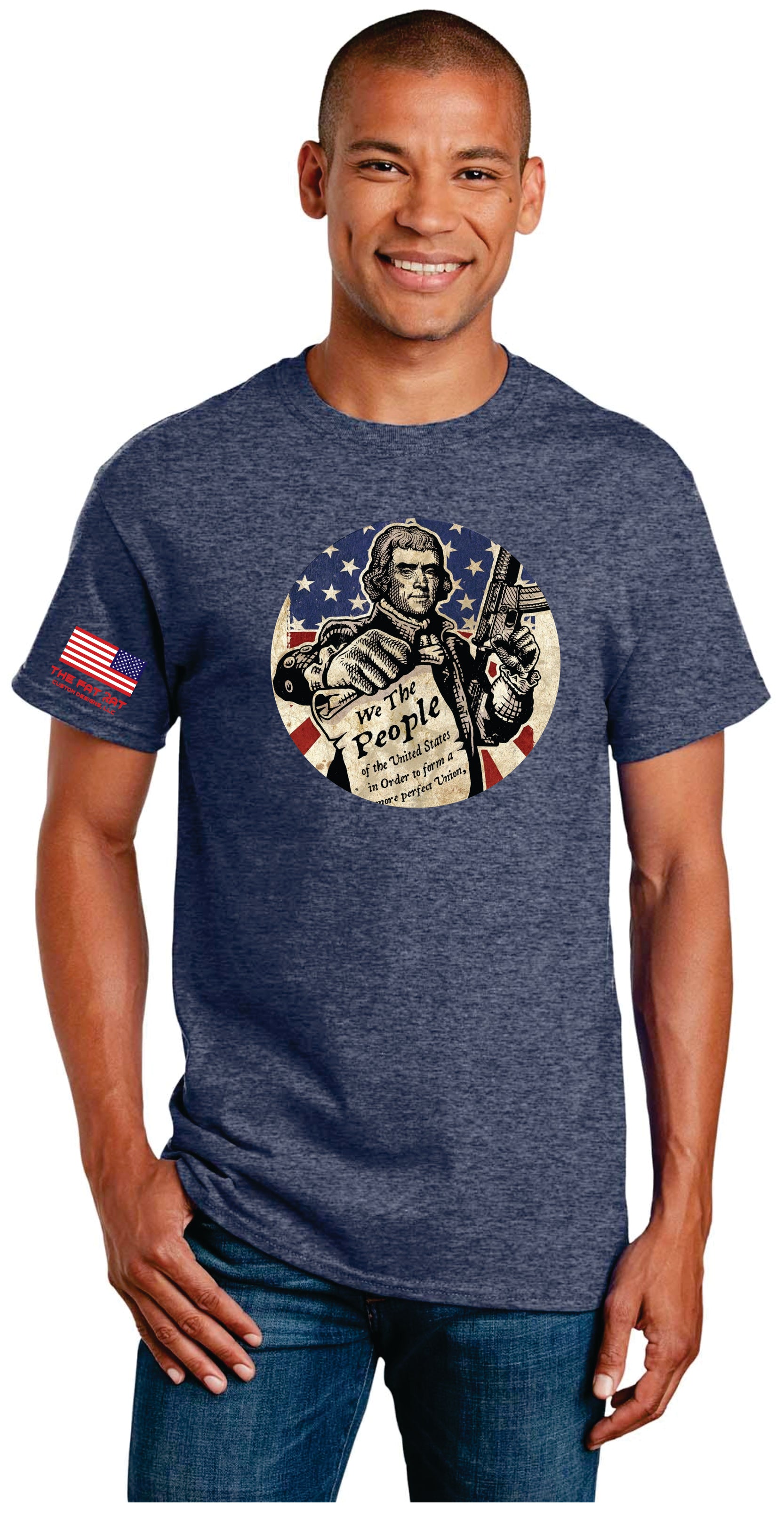 Stay comfortable and show your pride with our "We The People Are Armed Shirt". Crafted with 100% cotton, this versatile tee is perfect for all seasons. Join the movement and represent "We the people" with this Patriotic shirt. Stay Cool: This breathable shirt will keep you comfortable in warm weather. Loose-Fitting: Enjoy a relaxed fit with this loose-fitting shirt. All Seasons: This versatile piece can be worn year-round. Crew cut short sleeve: The classic design and timeless look make this shirt a staple. Colors: Choose between Navy Heather, Cardinal, and Sand, or get all 3! The Fat Rat Logo is featured under the American flag on the right arm, adding another patriotic touch to the design.