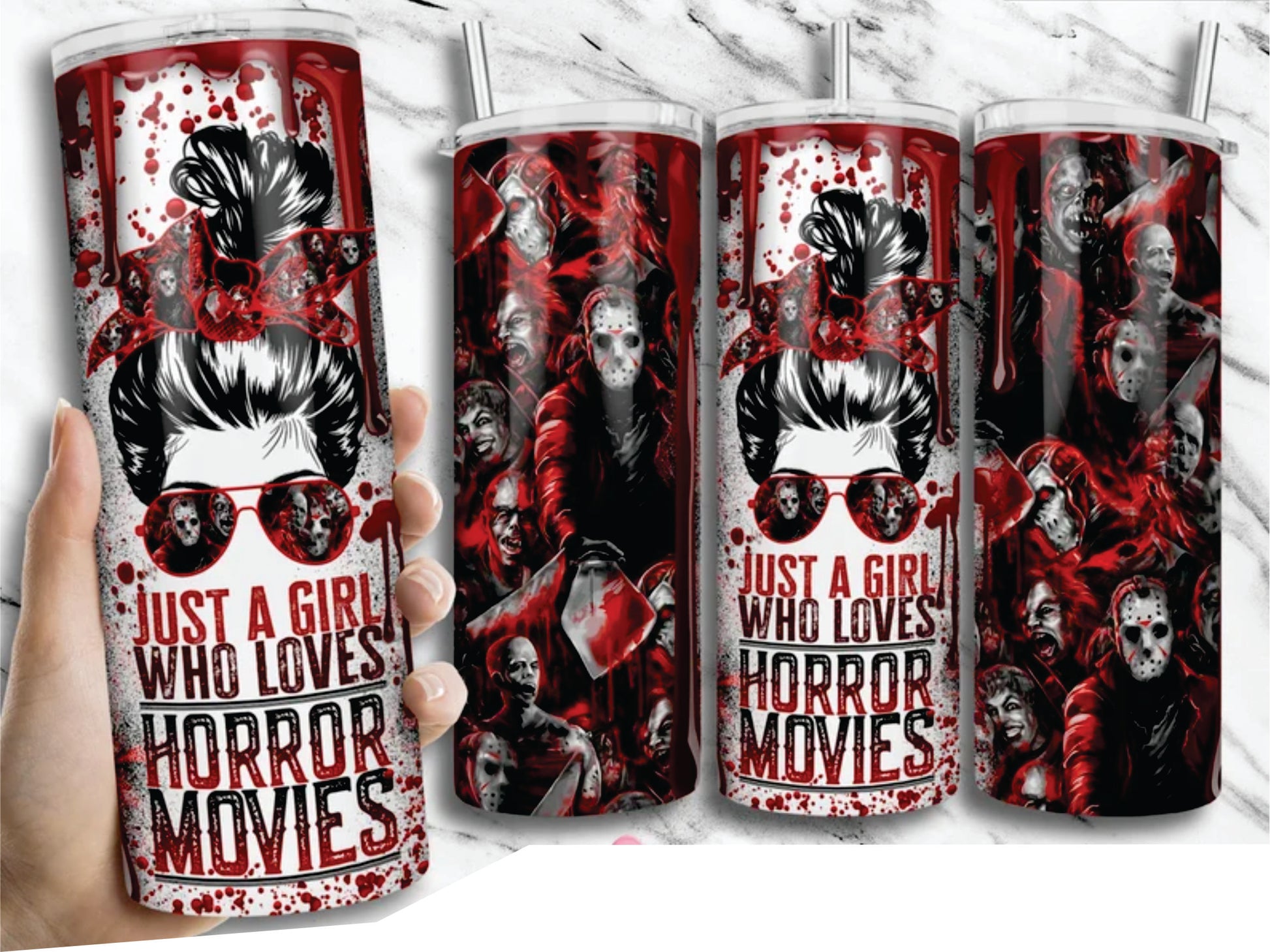Watch your favorite horror movie with this Stainless-Steel Insulated Tumbler! The image encompasses the whole tumbler. Available in a 12 or 20 oz size. Comes with a reusable stainless-steel straw.